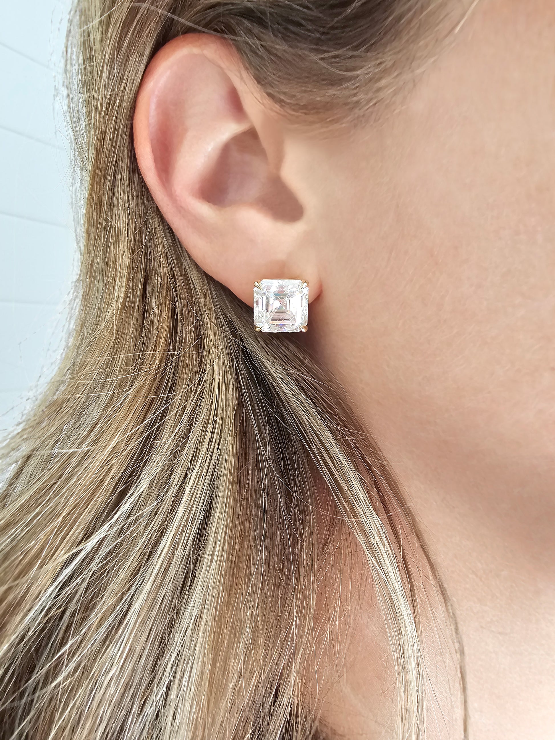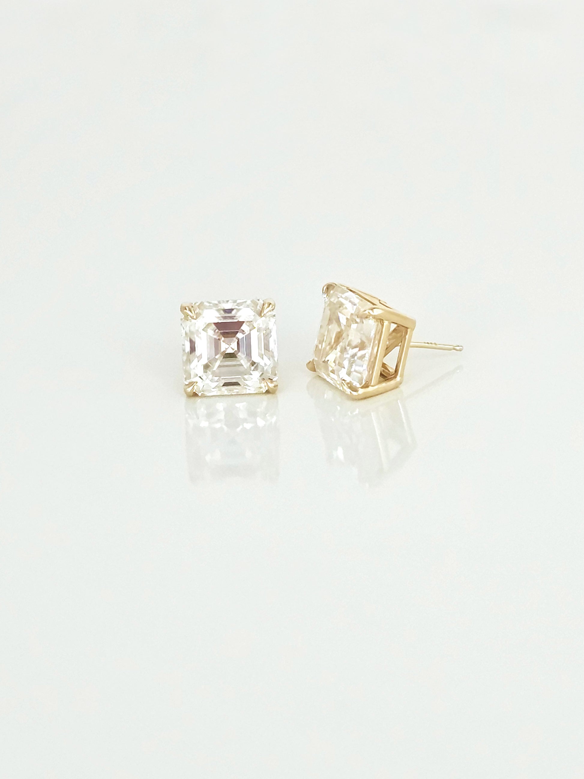Looking for a jewelry staple with a bold twist? Look no further than our Asscher-cut Diamond Studs! Pictured are lab-grown diamonds at 5 carats each, set in 14k yellow gold.